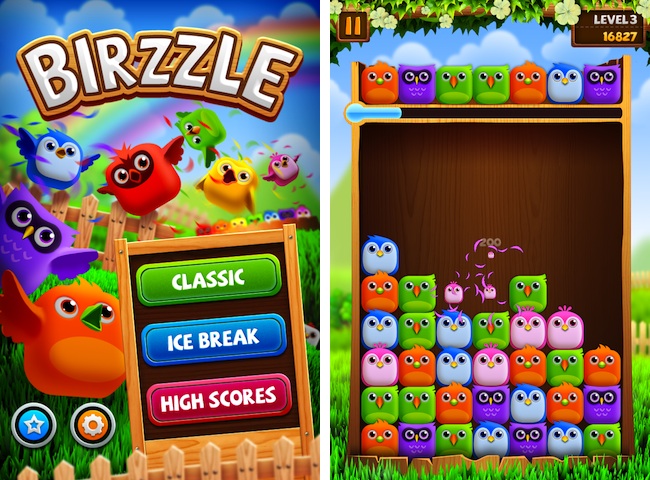 iBirzzle 的玩法类似对对碰,三个以上同种颜色的小鸟横/竖/L 型连在一起就能清除。但只能移动上面没有被压住的鸟,而且一次清除 4 个或更多只鸟的话,会有爆破(只炸四周)、炸弹(一炸到底)、激光等道具奖励。