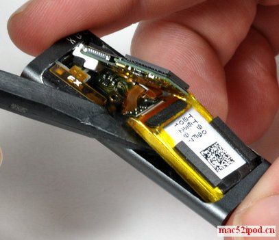 新一代苹果iPod Shuffle电池特写,电压3.7V,容量0.27Wh,标称播放时间为10小时。