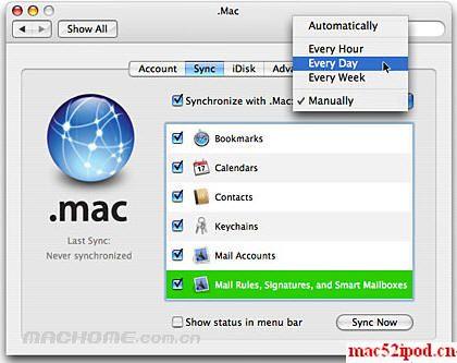 4.勾选“与 .Mac 同步”来启用同步功能,然后从弹出式选单里选择要手动、自动,或在特定的时间间隔之后同步项目。