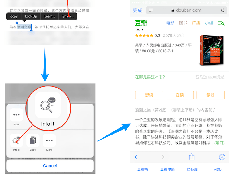 安装 Info It 后,第一次启动会给你看几步操作提示,以后就不用管了。无论在哪看到想查的书名、电影电视剧名,选中后点击「共享」,在下面的分享菜单里选择 Info It(没有的话去「更多」里添加),就能滑出上面右图所示的豆瓣页面。各种操作和网页里用豆瓣一样,因为其实就是在 Safari 里开了豆瓣,搞完点击左上角的「完成」,Safari 滑走,继续用以前的 App。